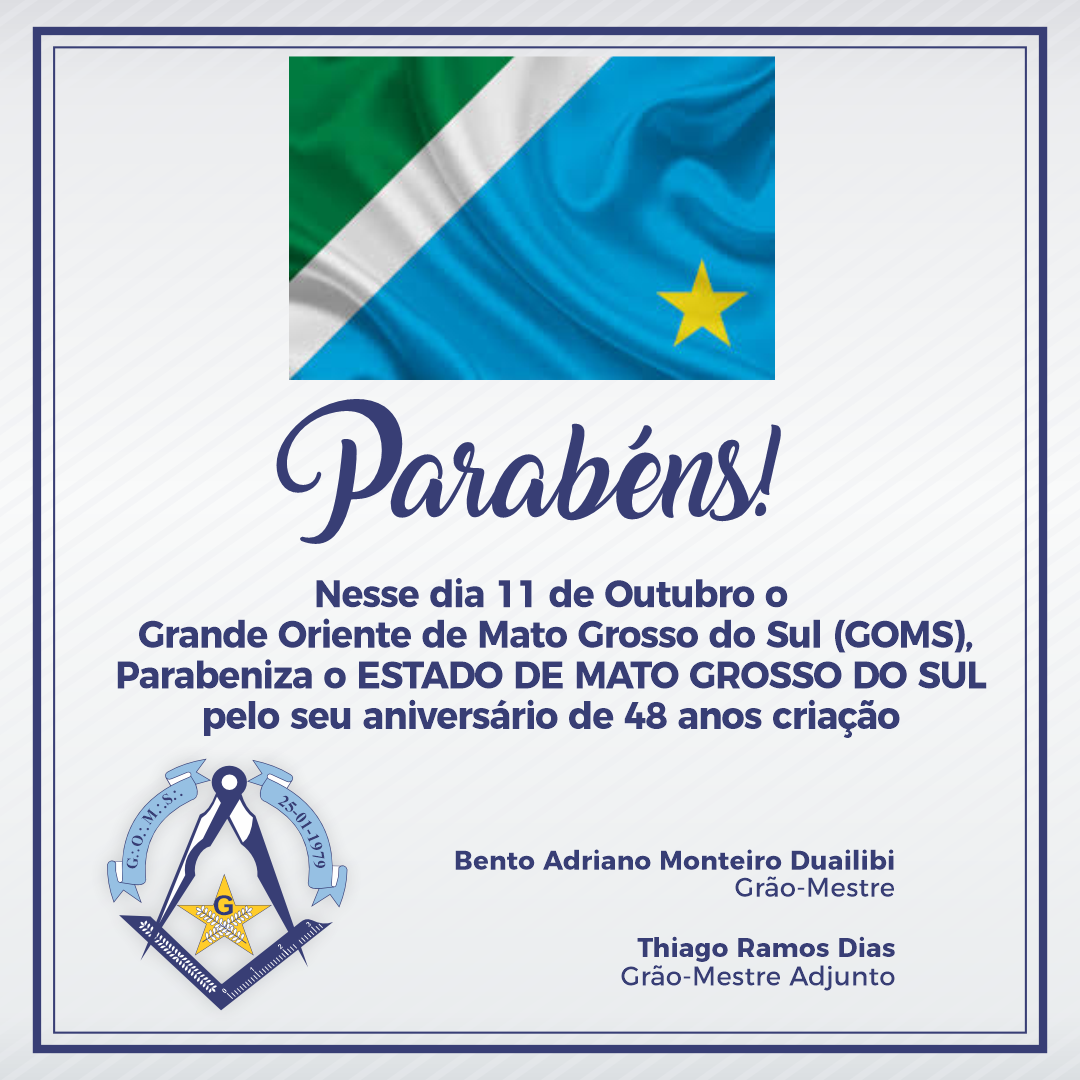 Neste 11 de outubro, o Grande Oriente de Mato Grosso do Sul celebra com orgulho a história, as tradições e as riquezas do nosso estado. Que a data nos inspire a preservar nossas raízes, valorizar nosso povo e fortalecer ainda mais o sentimento de pertencimento a esta terra abençoada, repleta de cultura, natureza e fraternidade.