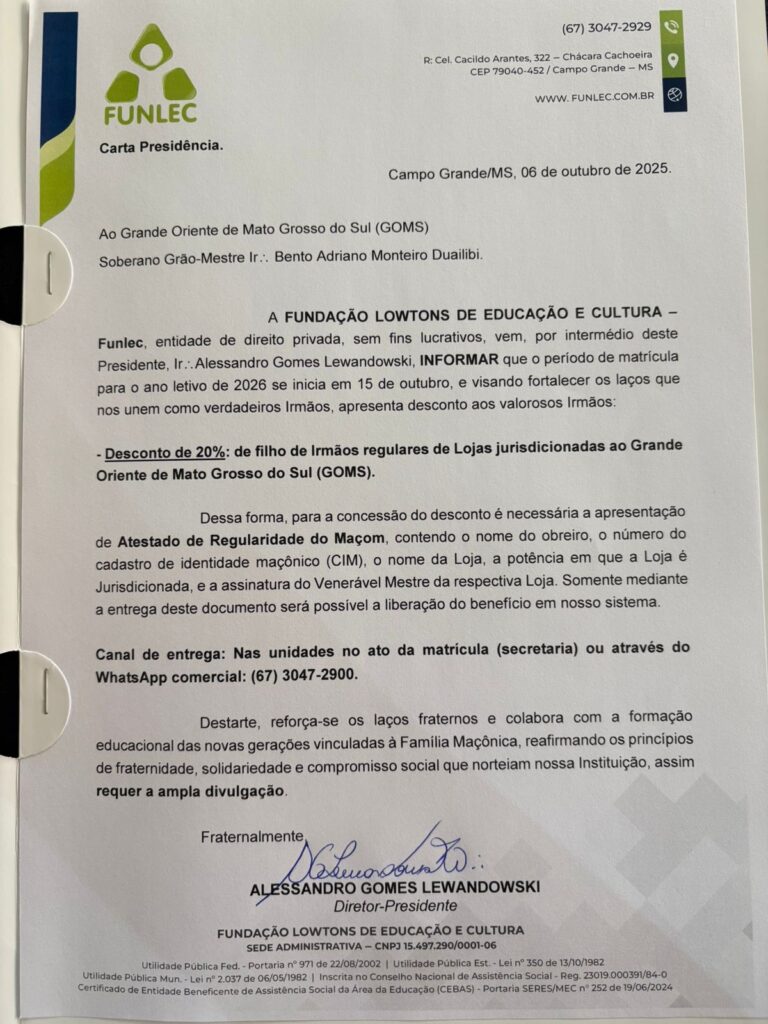 O Grande Oriente de Mato Grosso do Sul (GOMS) firmou, na data de 08 de outubro de 2025, uma parceria histórica com a Fundação Lowtons de Educação e Cultura (FUNLEC).