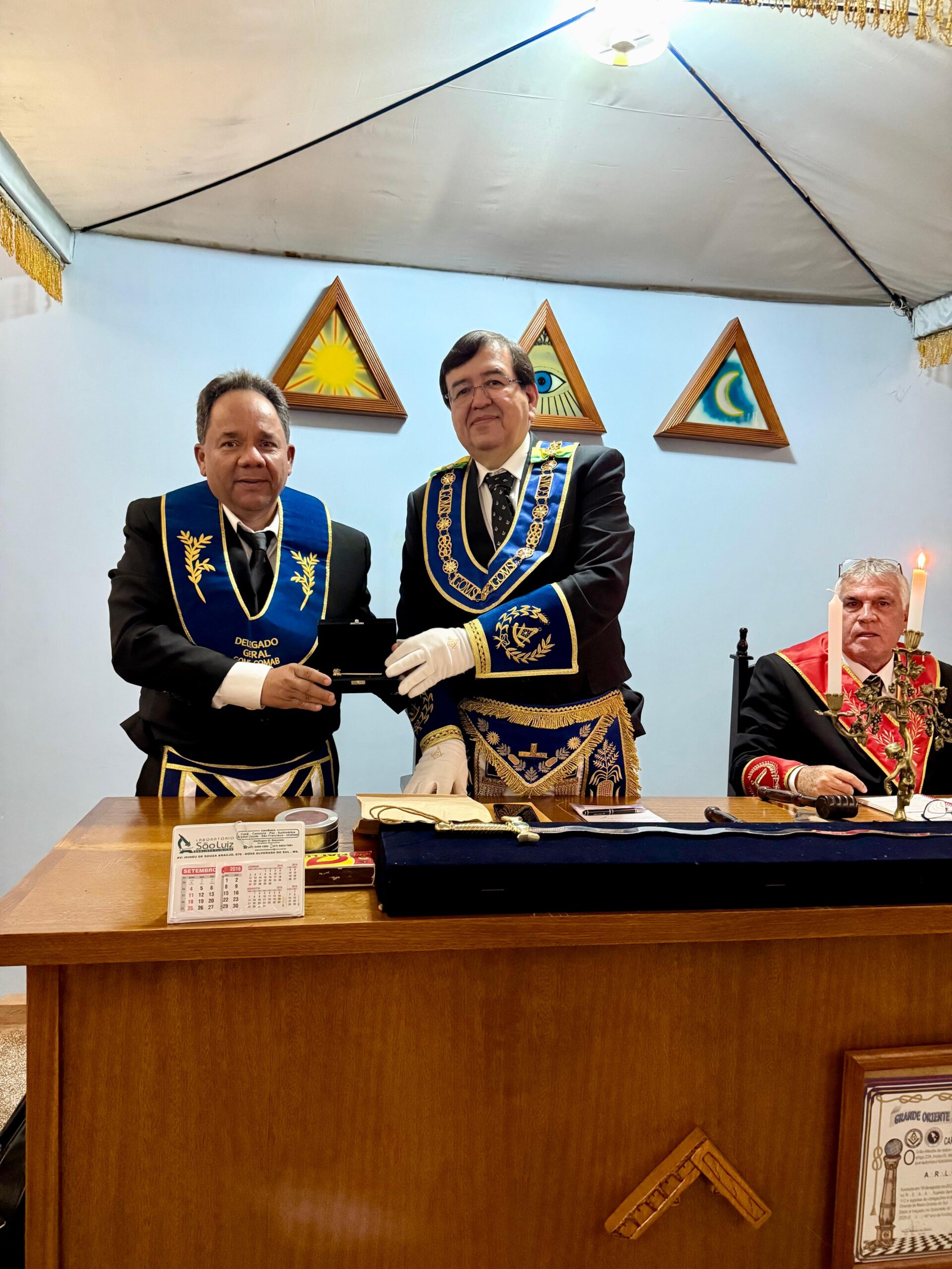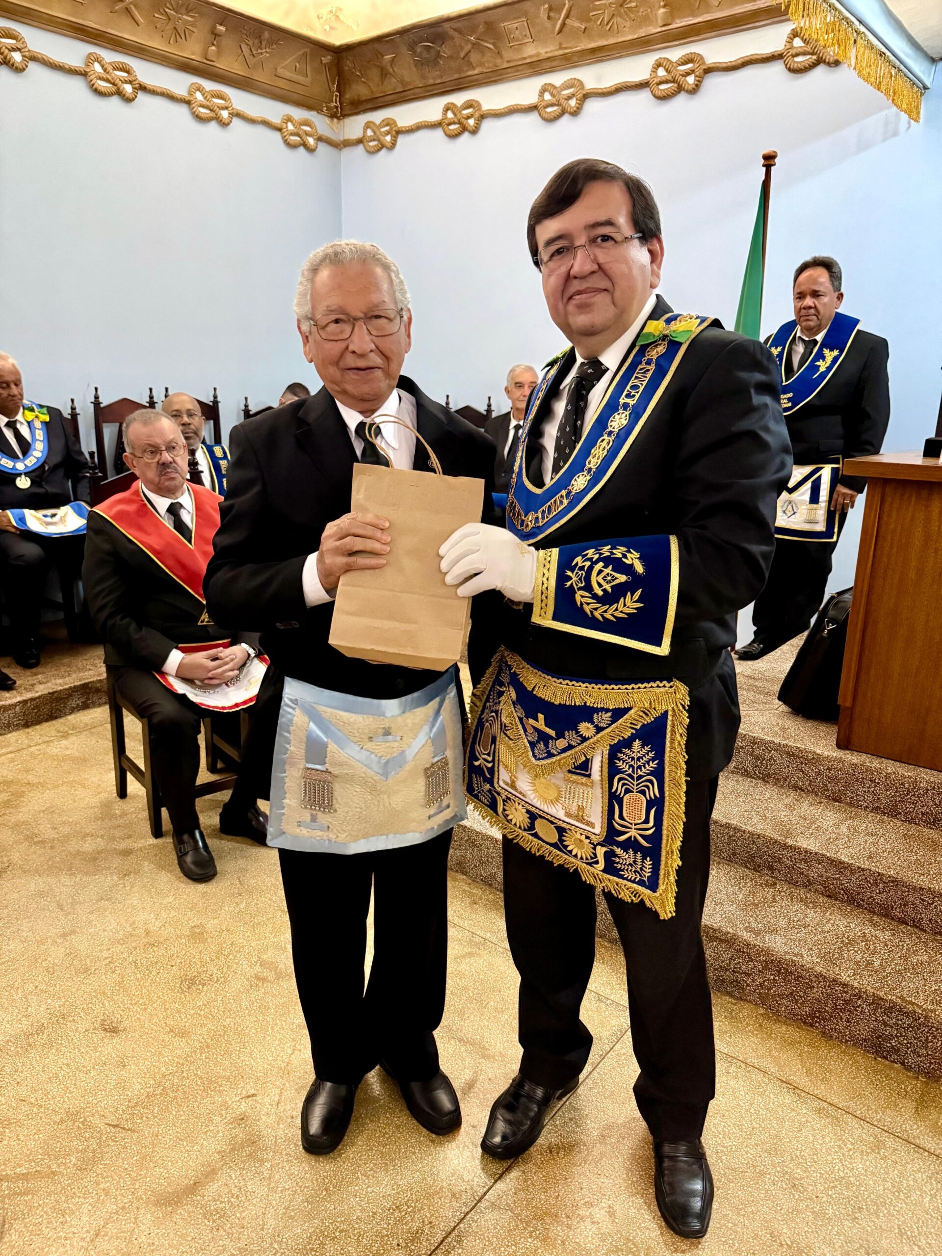 Como gesto de reconhecimento, o Grão-Mestre entregou um “mimo de malhete de vigilância” ao Ilustríssimo Irmão Wilson, Delegado Geral do GOMS, homenageando sua dedicação, empenho e atuação decisiva na fundação da ARLS Nova Alvorada nº 51.